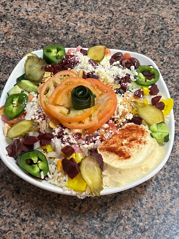 Romaine lettuce with beets, olives, onions, shredded cabbage and carrots, cucumbers, tomatoes, pepperoncini and feta cheese.