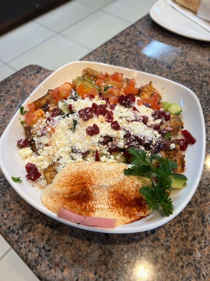 A bed of smooth Hommous filled with bite-sized pieces of Beef sautéed with almonds.